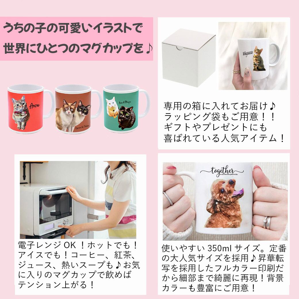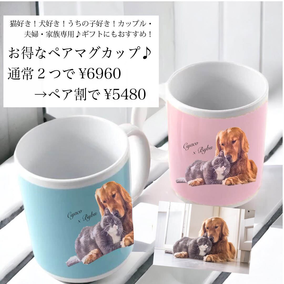 愛猫・愛犬・ペット・お子様などのイラスト入りマグカップをお作りします!愛するペットのお写真から、オリジナルイラストを制作。ネコちゃん、ワンちゃんはもちろん、小鳥・ハムスター・うさぎ・モルモットなど、小さなご家族にも対応しています♪