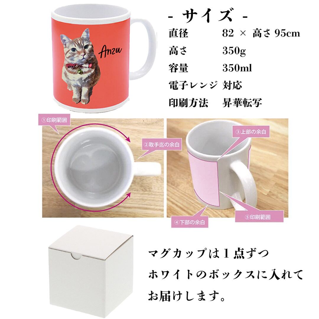 毎日のティータイムやコーヒーブレイクにぴったり!陶器製なので高級感もたっぷりです。使いやすいスタンダードな350mlサイズを採用!陶器製なので見栄えもよし♪大切な家族のイラストを鮮やかかつ繊細に印刷、大切にお届けいたします♪