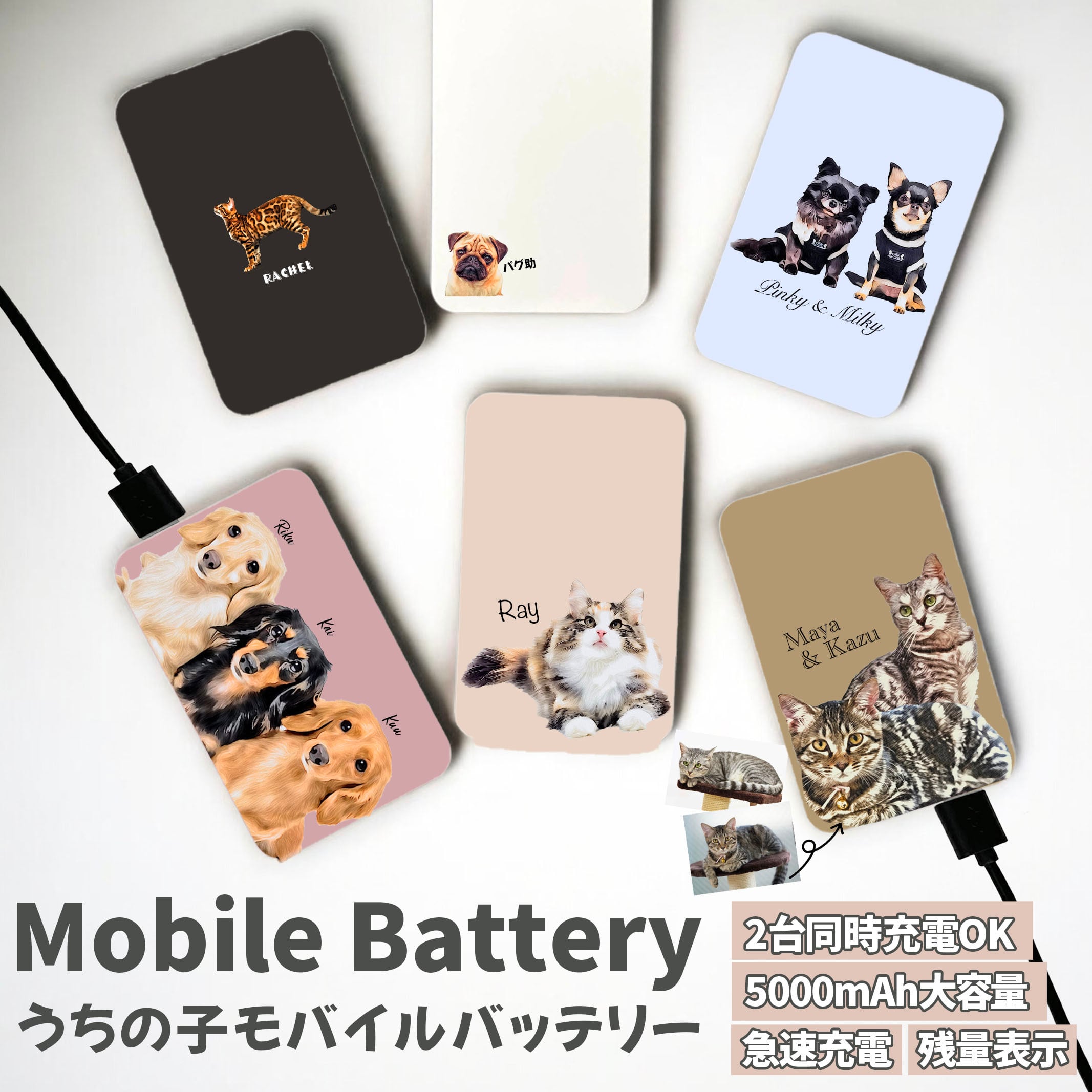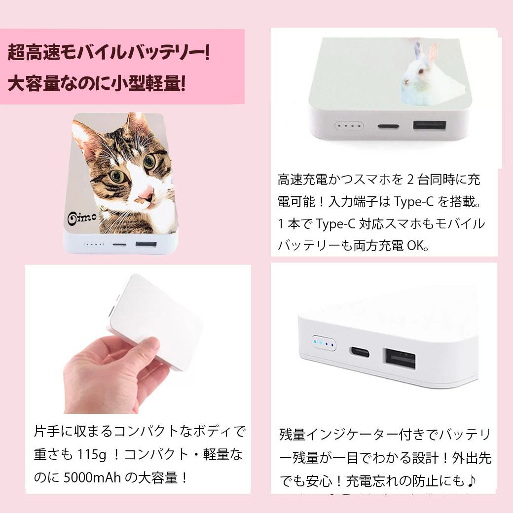 世界にひとつだけの「高機能モバイルバッテリー」を、愛猫・愛犬などの大切なご家族のお写真を送るだけで作れます!猫好き、犬好きへのギフトやプレゼントにも喜ばれる、おすすめのオーダーメイドグッズです♪