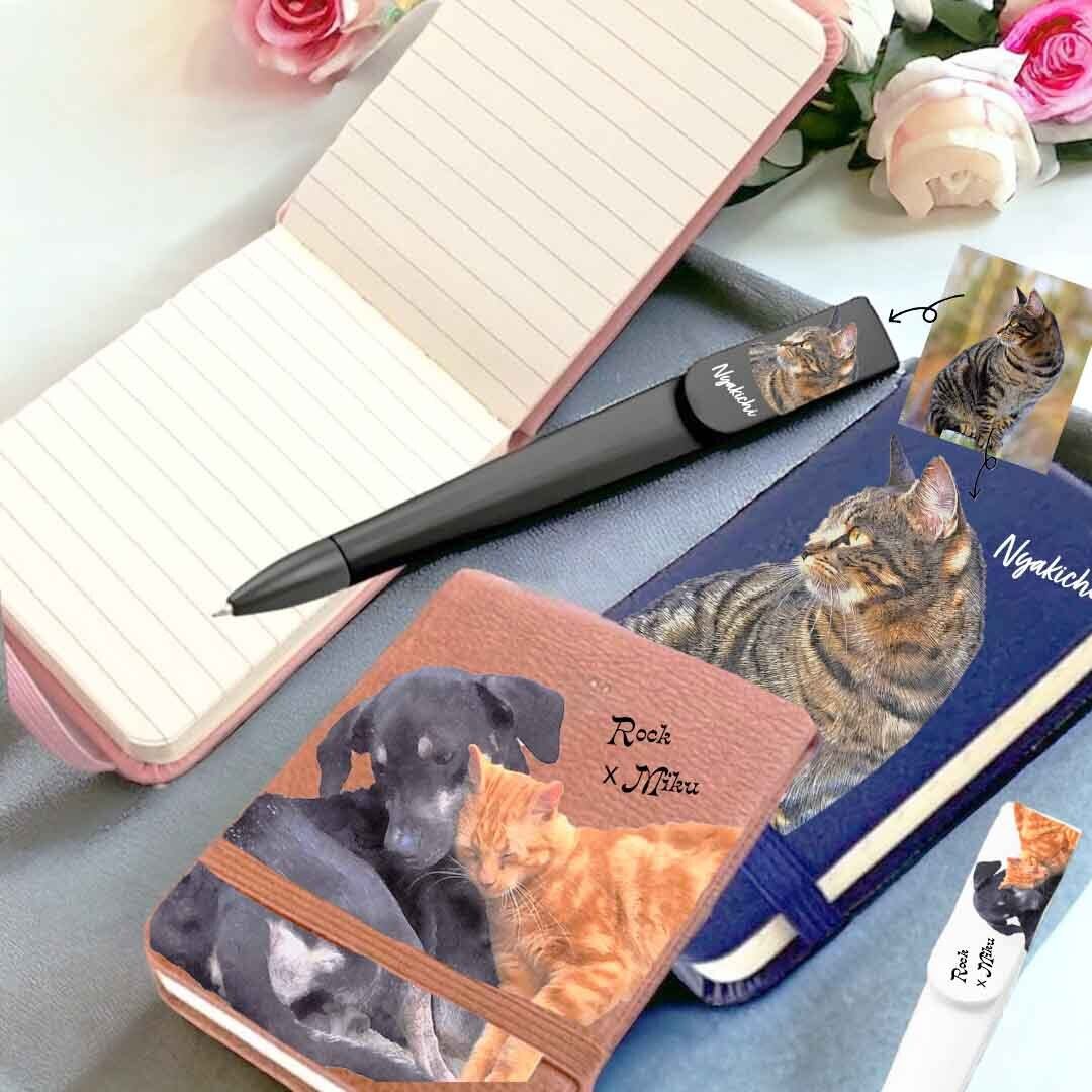 世界にひとつだけの「うちの子イラストPUレザーメモ帳ノート」と「グッドデザイン賞受賞のラペルボールペン」を、愛猫・愛犬などの大切なご家族のお写真を送るだけで作れます!